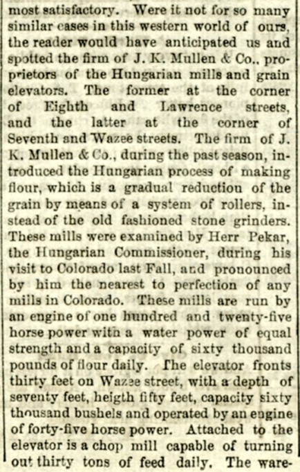 A search of the Colorado Historic Newspapers Collection turned up this article from the Jan. 1, 1882 edition of the Rocky Mountain News (Denver, Colorado), describing the J.K. Mullen & Co. Hungarian mills and grain elevators.