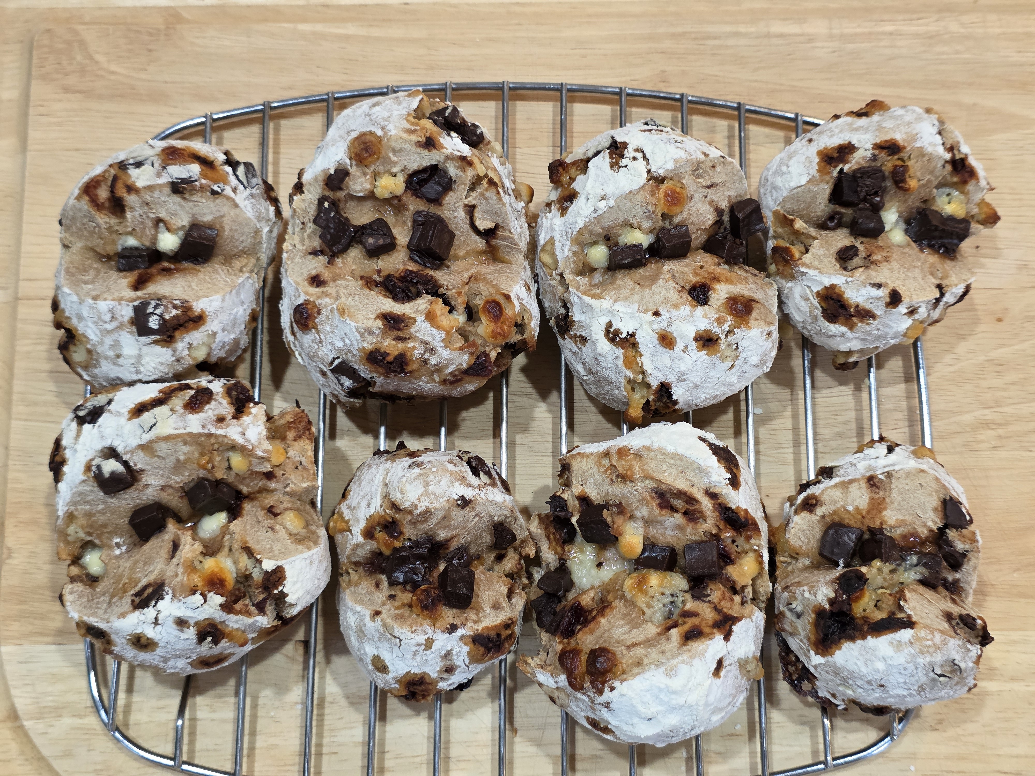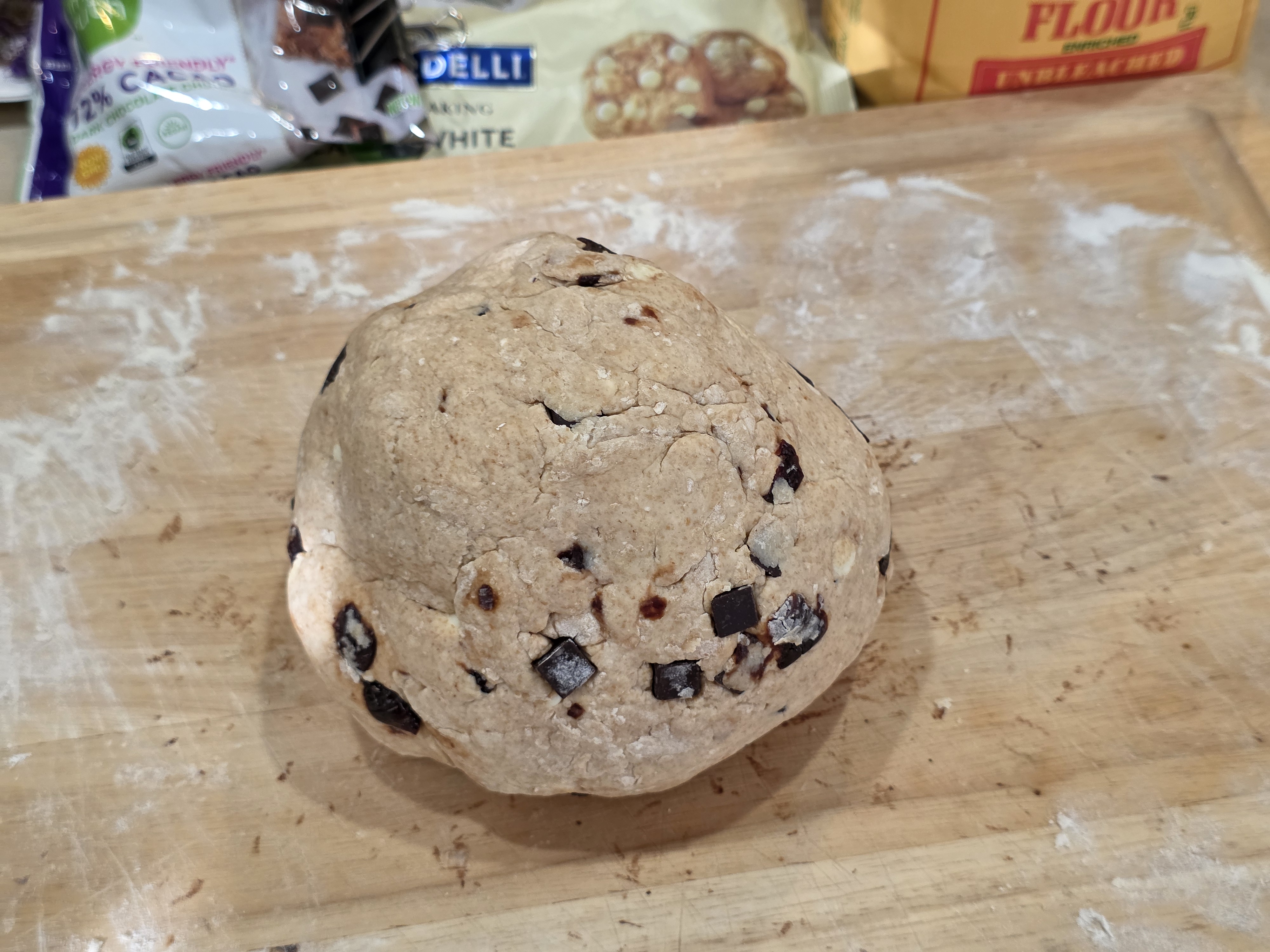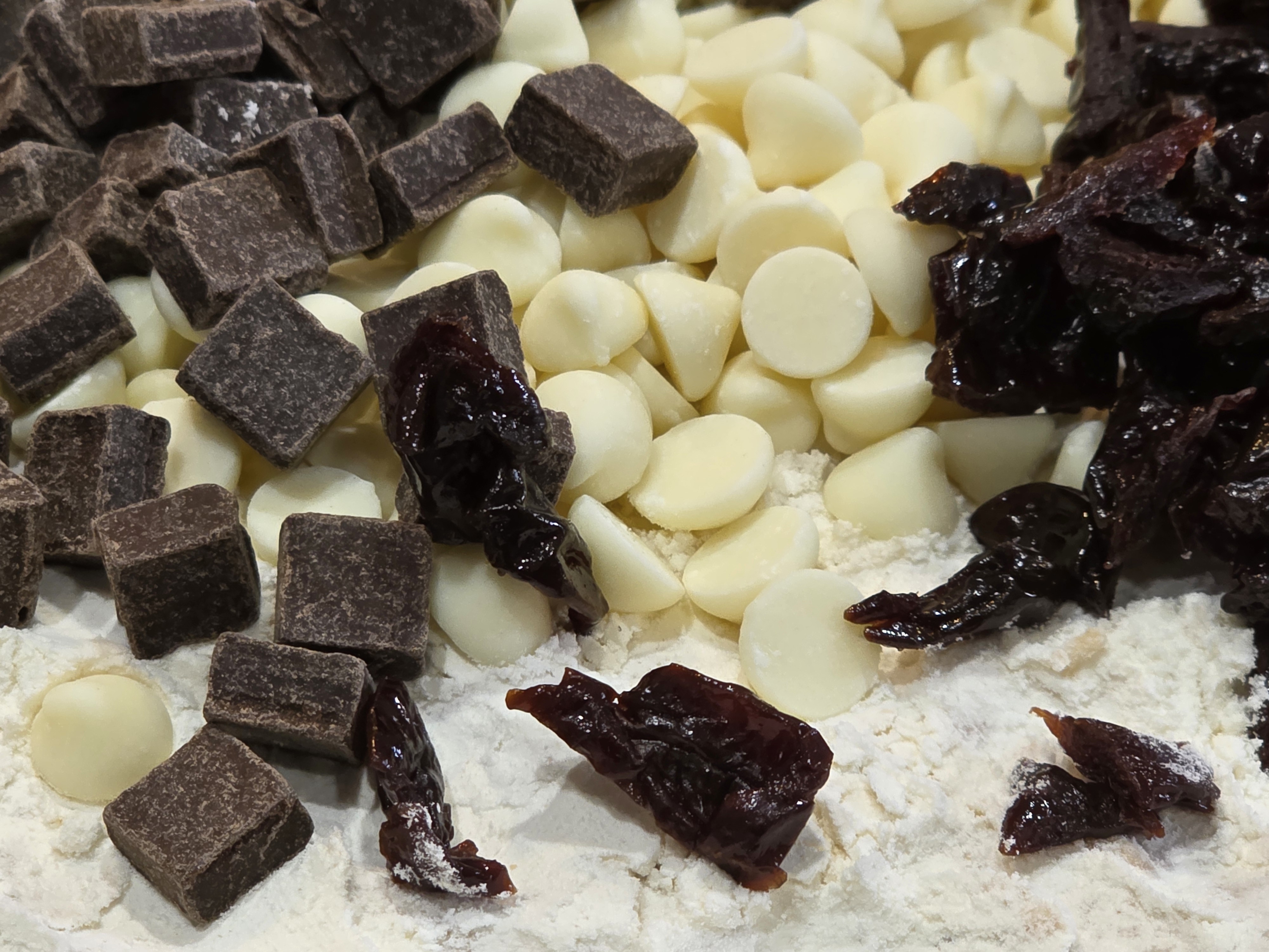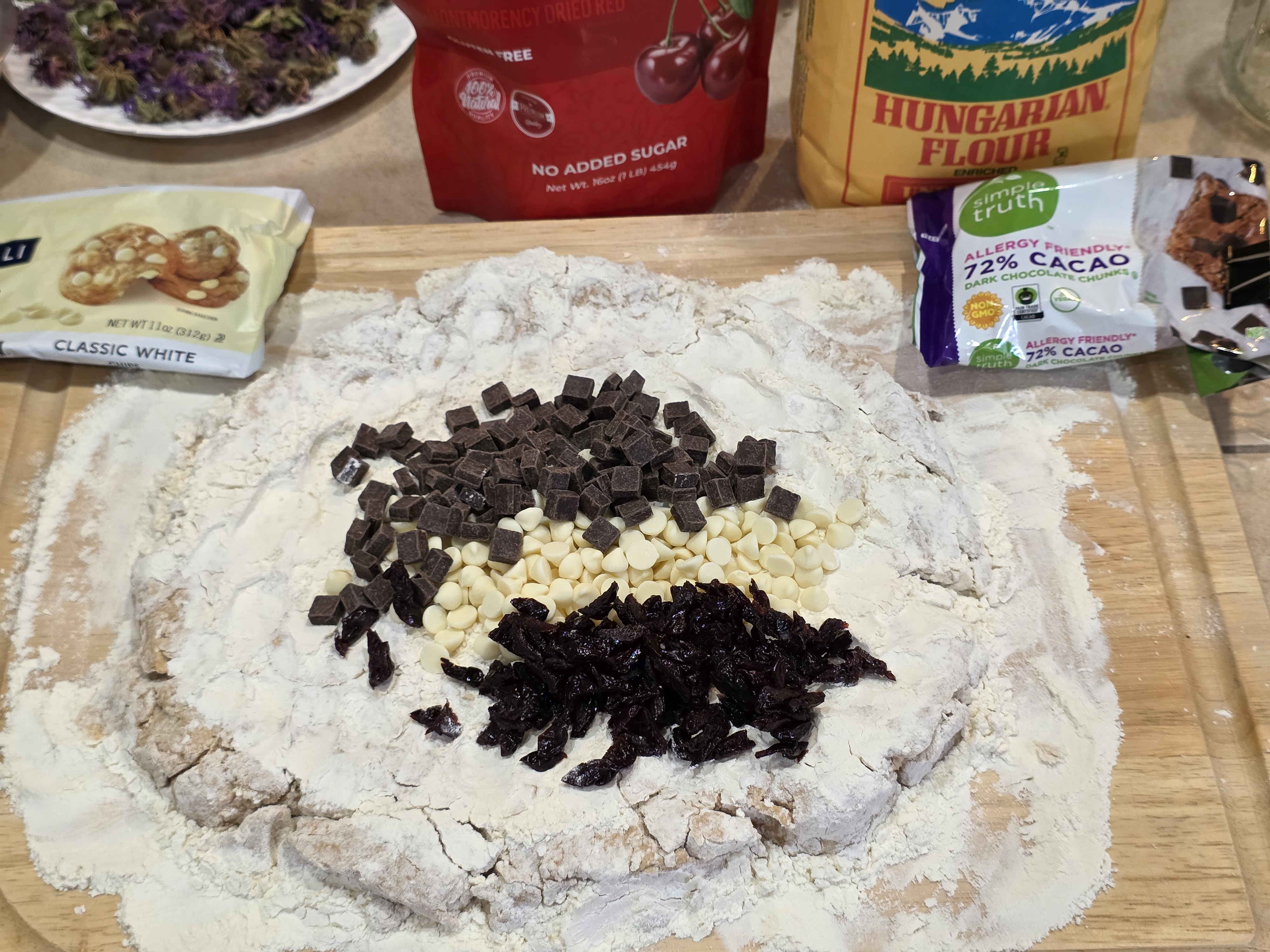 The bowl was emptied onto the wooden board, sprinkled with flour, and the inclusions were placed on top. For this bake we have dark chocolate chunks, classic white chips, and dried tart Montmorency cherry pieces.