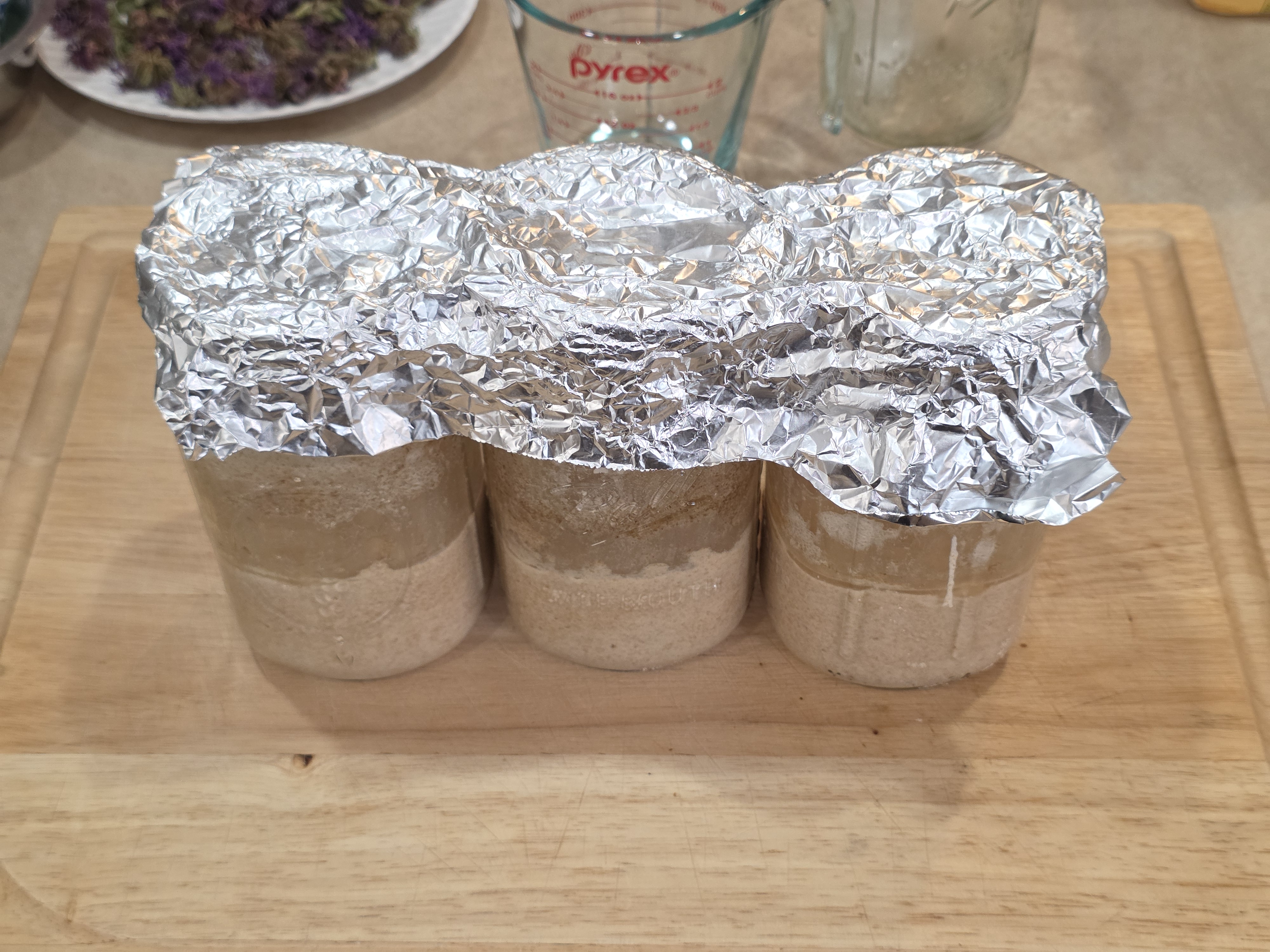 In this experiment we begin with three glass jars containing sourdough starter. The jars had been sitting on the counter for a couple of days.