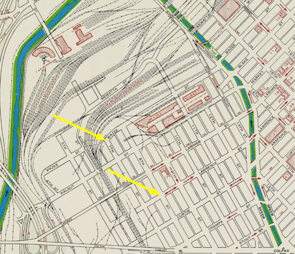 The Denver Public Library Digital Collections had this historical map of the area on their website, and I added two yellow arrows pointing to the grain elevator (upper) and mill (lower) locations.