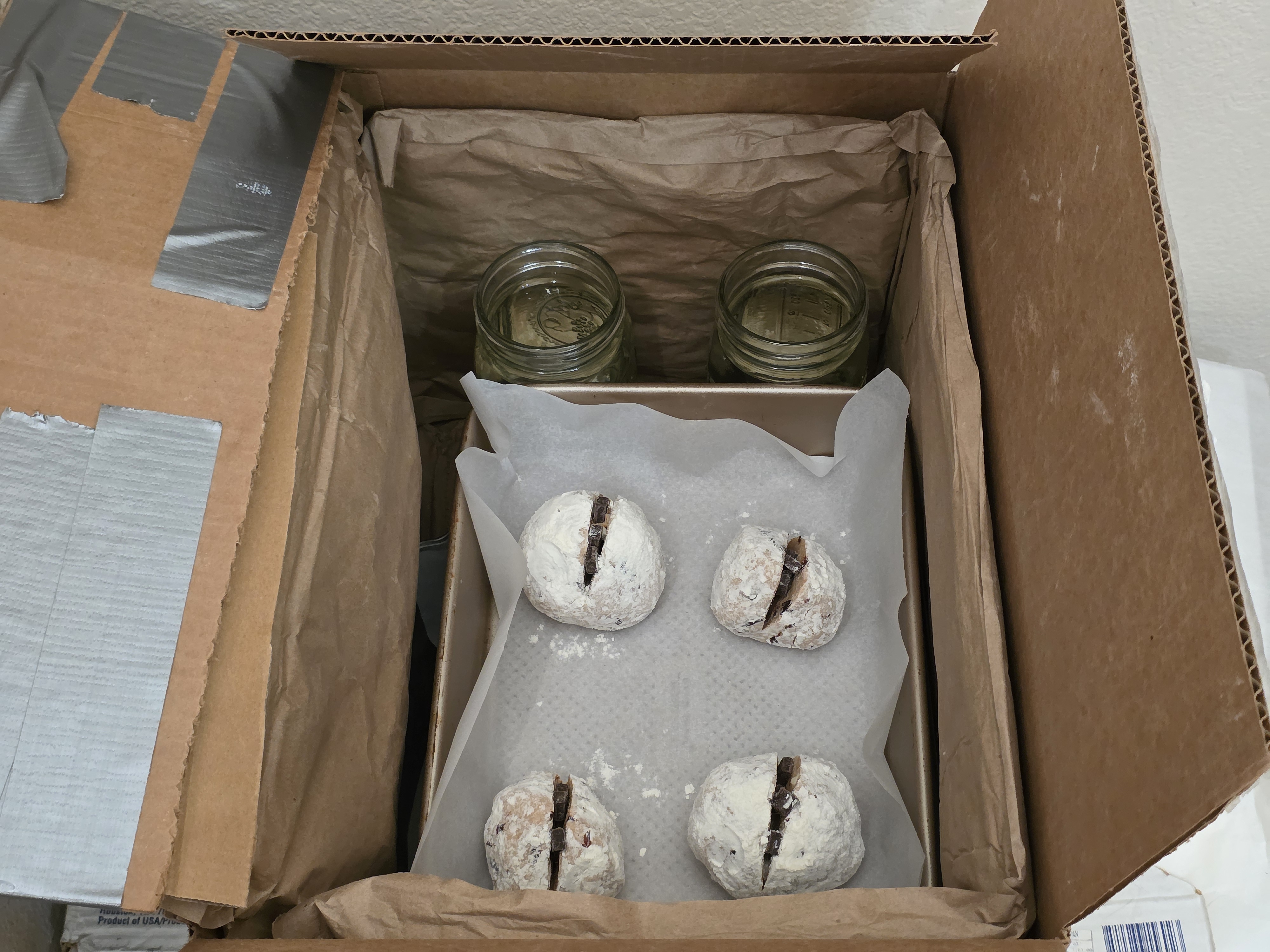 The baking pans were placed in an insulated proving box along with glass jars of hot tap water to keep the environment warm and humid.
