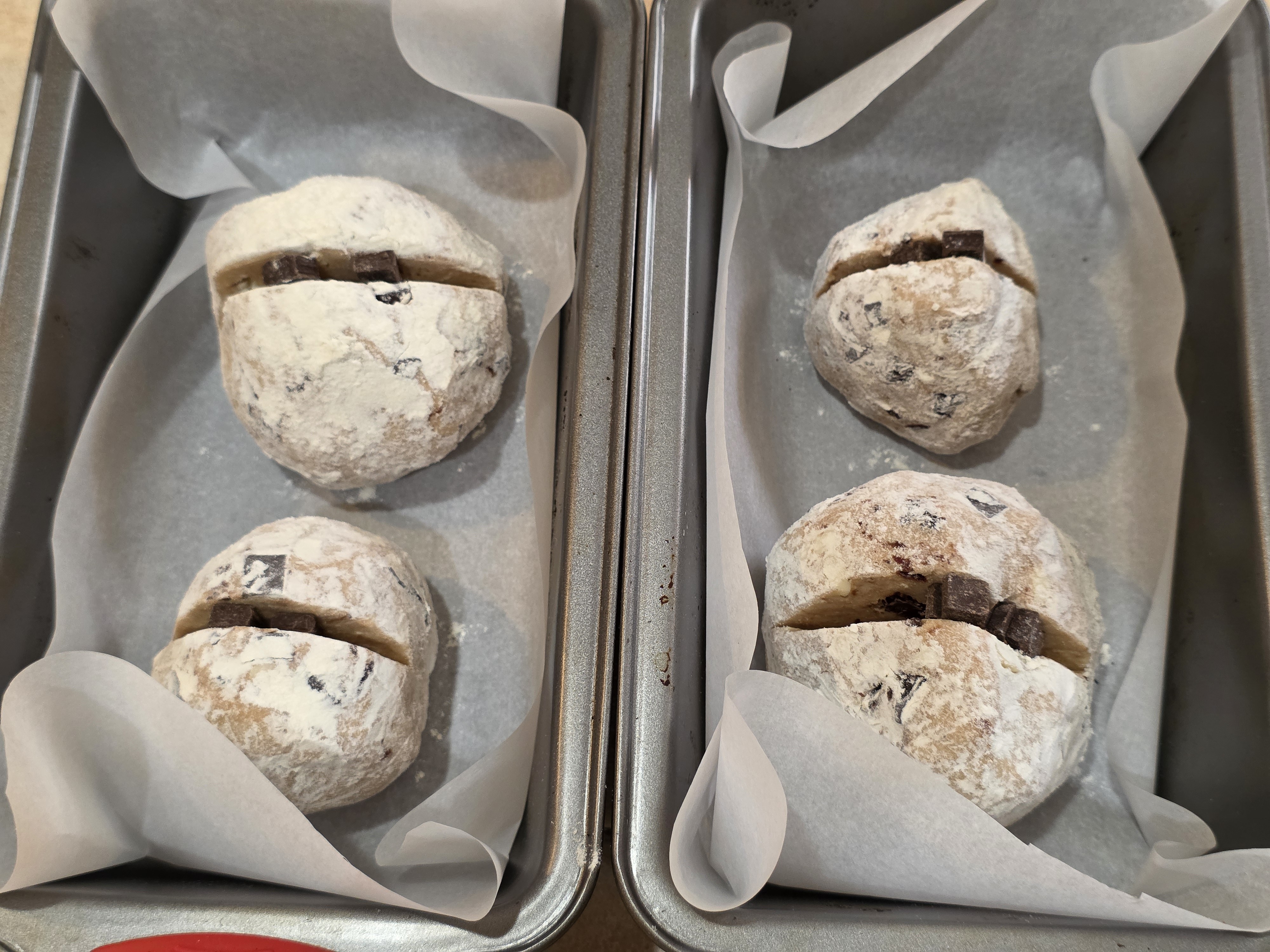 The pans were allowed to sit in the proving box for several hours to allow the dough to leaven. In this case, the pans sat overnight, in preparation for a morning bake.