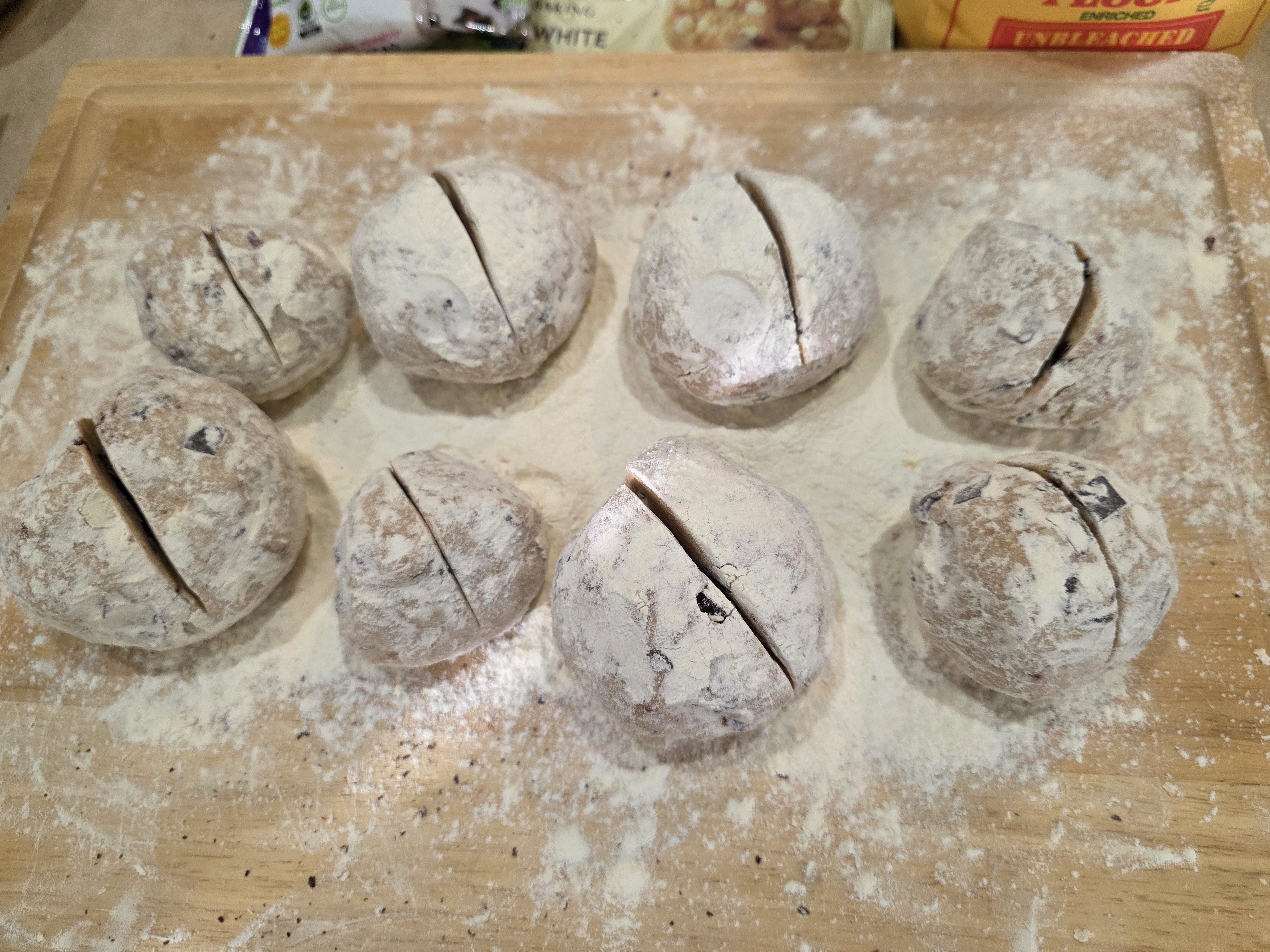 Next, the large ball of dough was cut into smaller pieces, rolled into balls, dusted with flour, and scored with a knife.