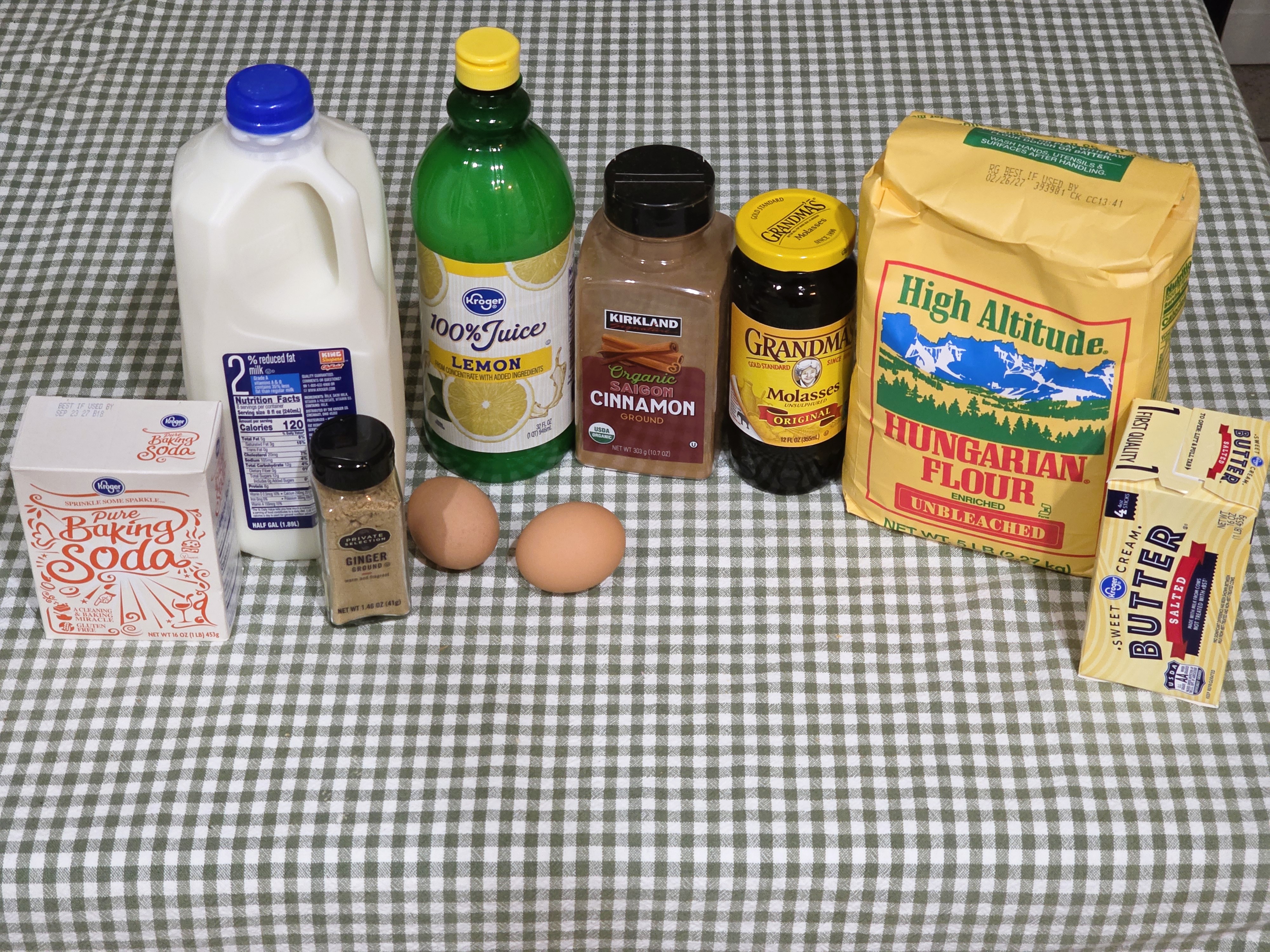 The butter, molasses, sugar, sour milk, soda, ginger, cinnamon, and eggs were mixed thoroughly.