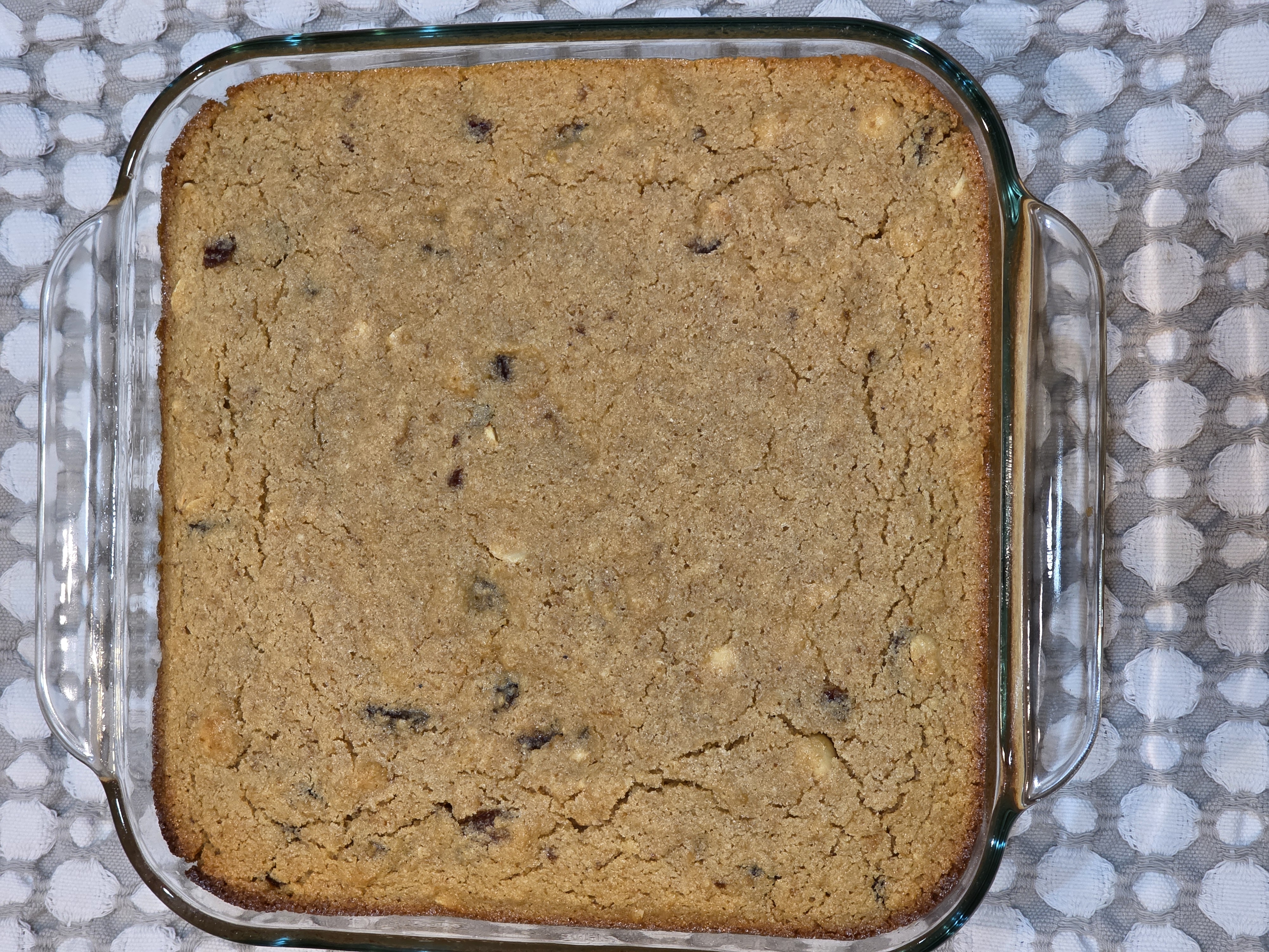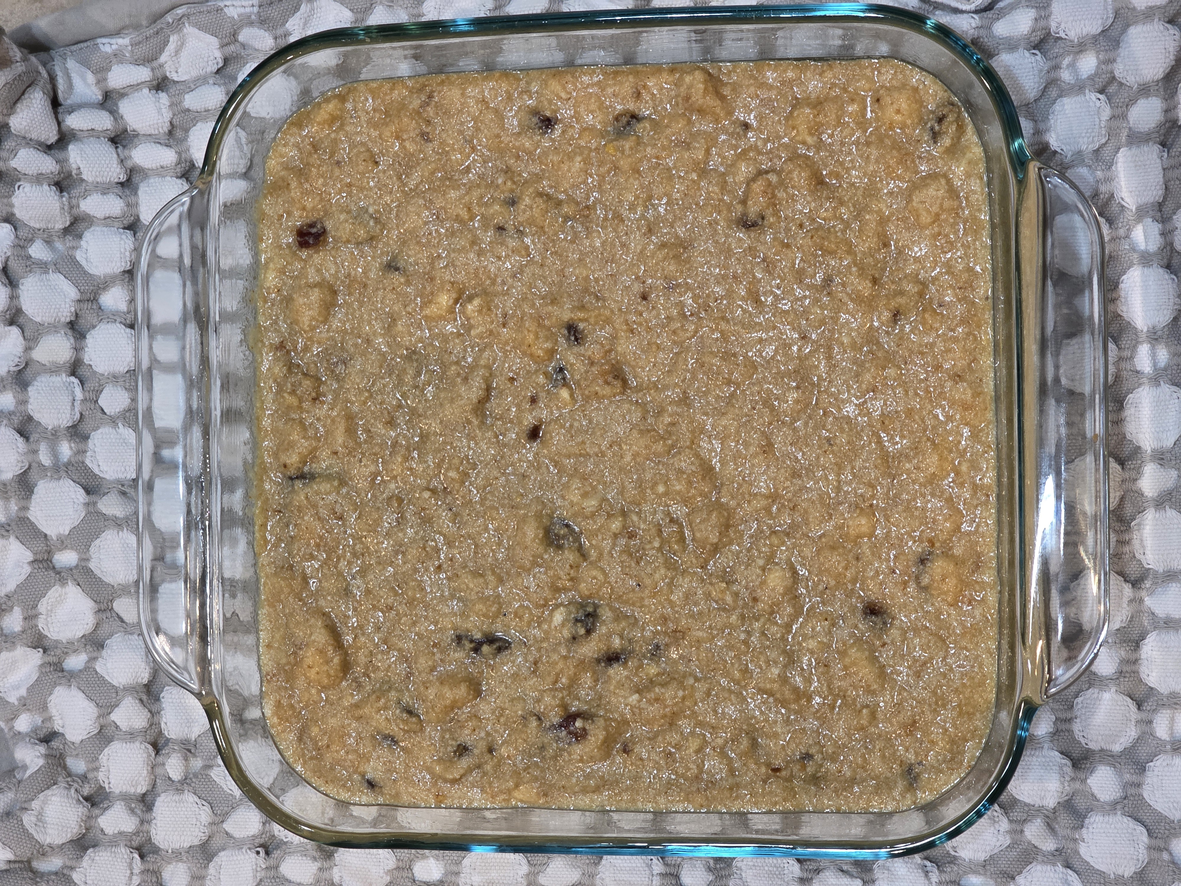 Next, all ingredients were apportioned as prescribed, mixed in a large bowl, and poured into a greased pan.