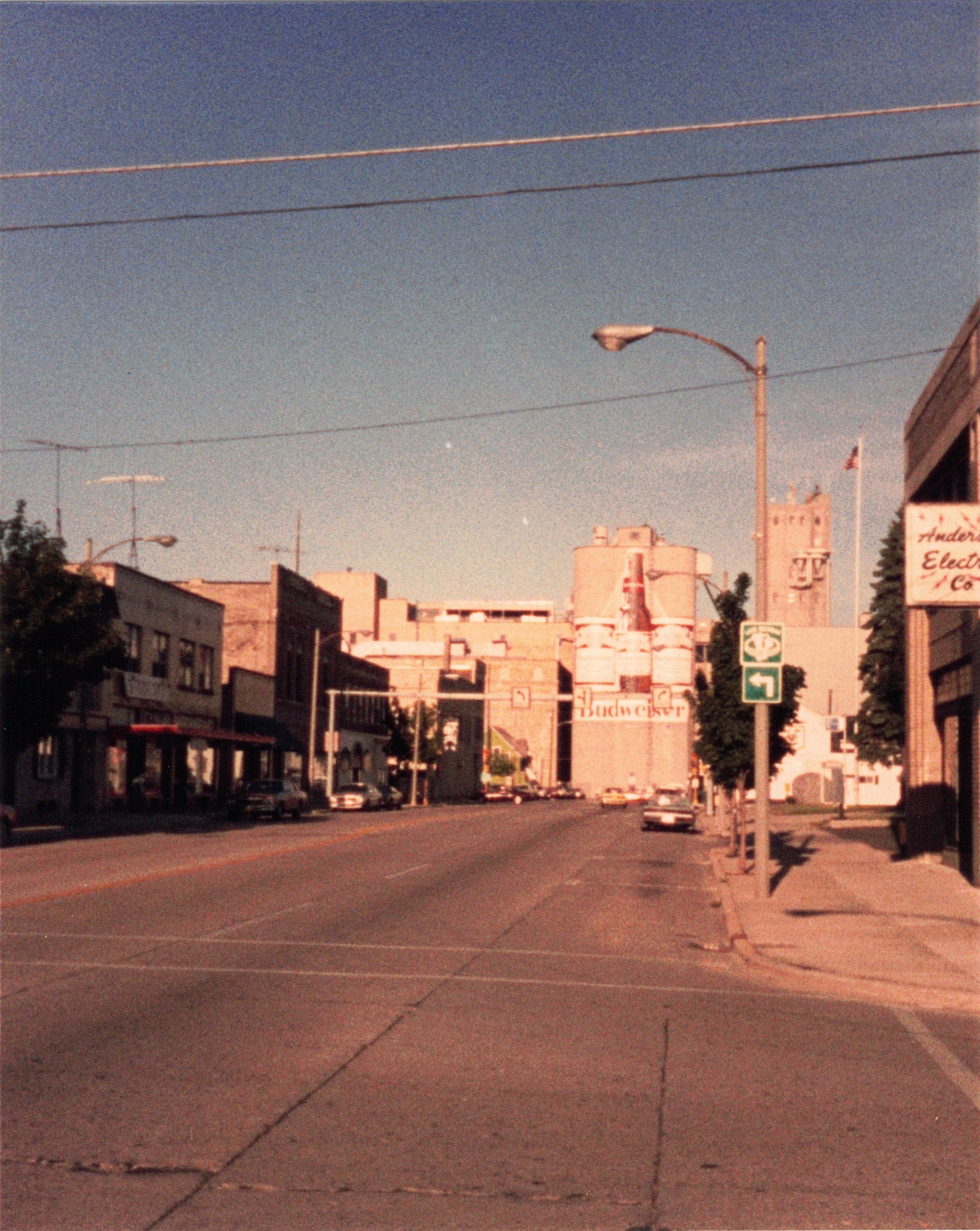 Downtown Manitowoc, Wisconsin at the corner of S. 8th Street and Washington Street, along the Vietnam War Veterans Memorial Highway. The Budweiser silos have since been rebranded.