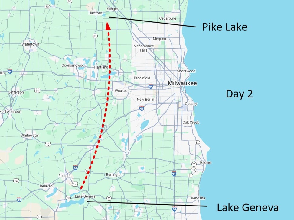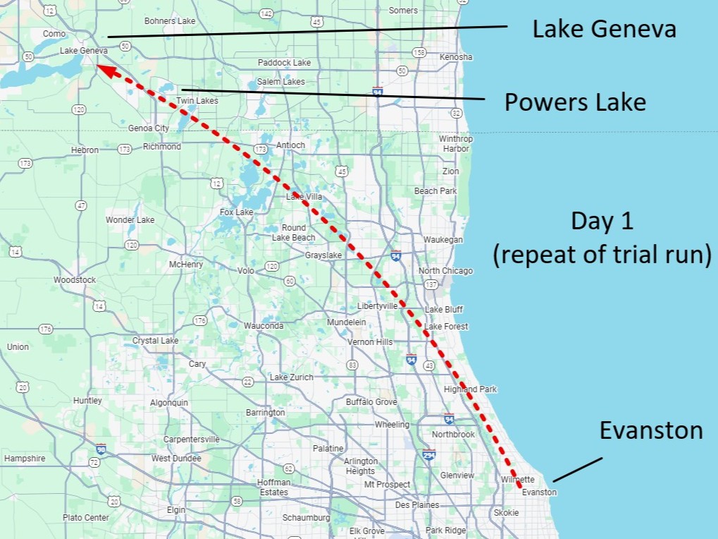 Route from Evanston to Lake Geneva, with stop at Powers Lake