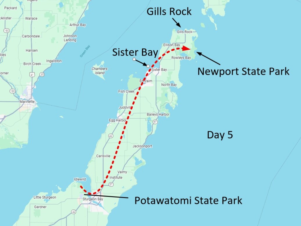 My plan for tomorrow is to ride to Potawatomi State Park near Sturgeon Bay, and then Friday ride to Newport State Park. That will be two short rides, giving me some extra time to recover.