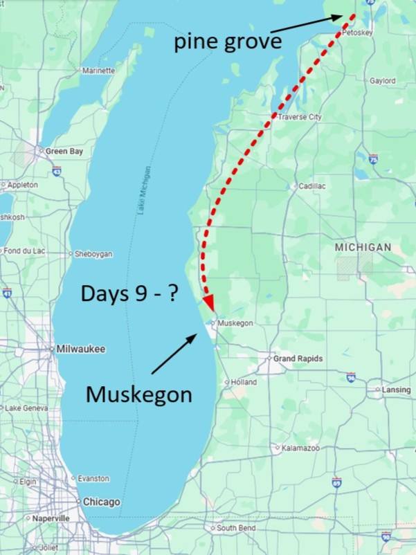 Route from the pine grove campsite to Muskegon