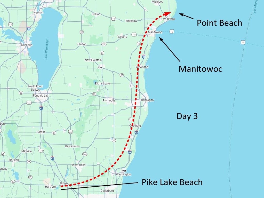 Route from Pike Lake Beach to Point Beach, traveling through Manitowoc