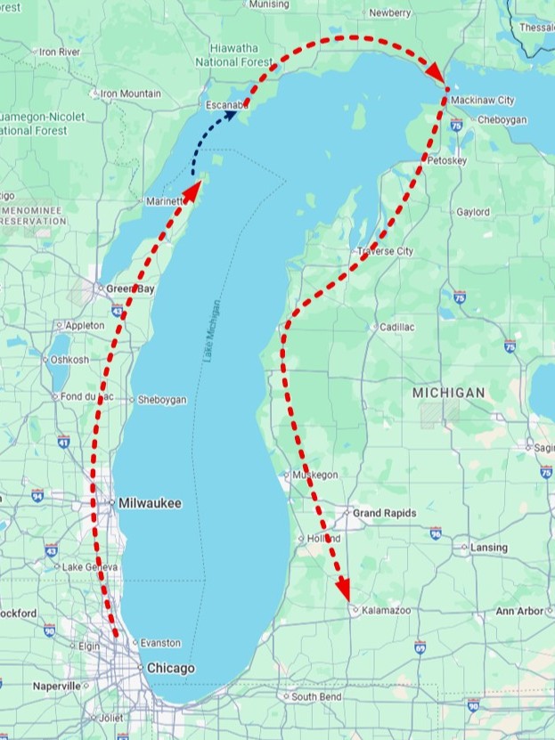 Route from Evanston, Illinois to Kalamazoo, Michigan via Door Peninsula of Wisconsin and Upper Peninsula of Michigan