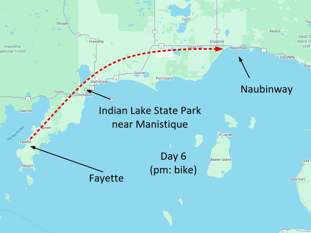 Once I leave Fayette and begin riding, some incredible tailwinds pick up on the Upper Peninsula, and instead of stopping at Indian Lake State Park near Manistique which I had thought I might do, I ride an additional 50 miles and make it all the way to Naubinway.