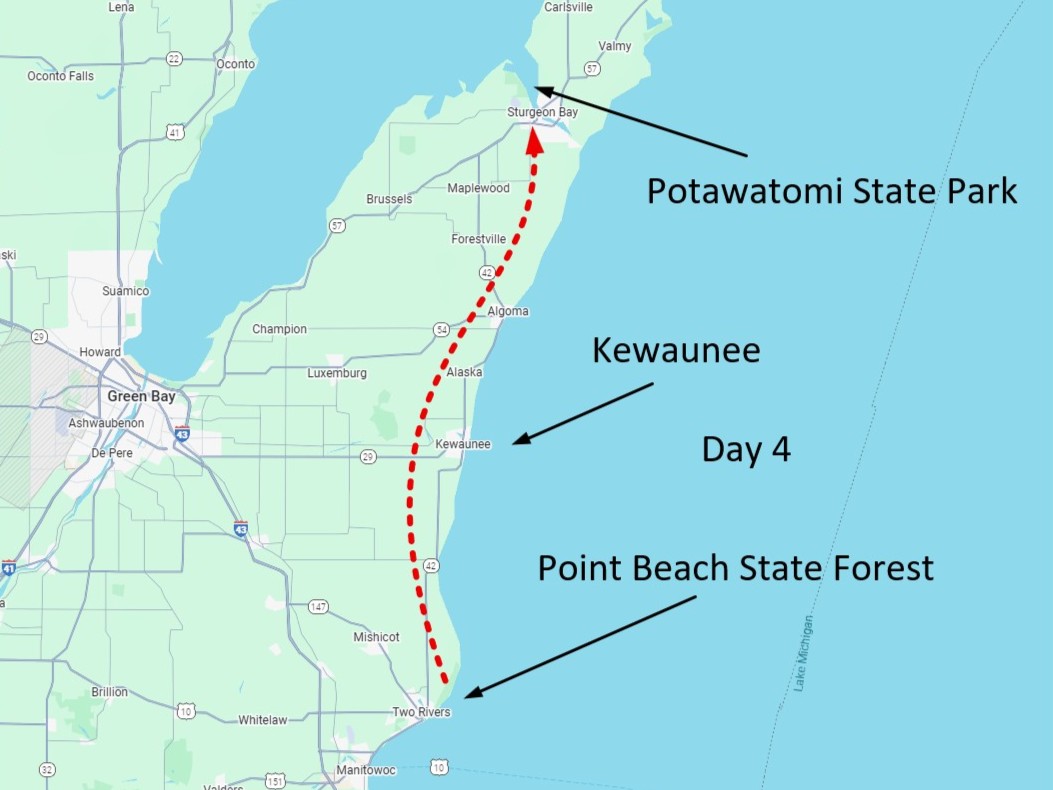 Route from Point Beach State Forest to Potawatomi State Park, traveling through Kewaunee